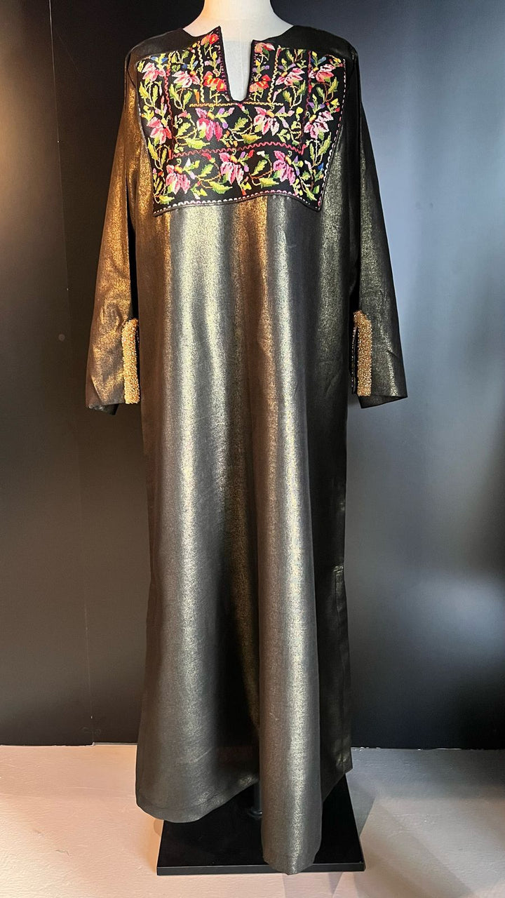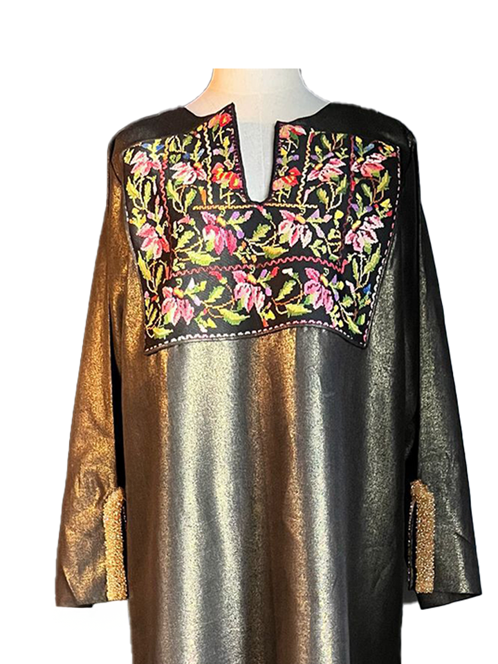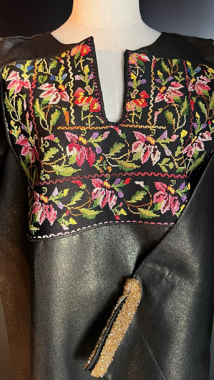 An original handmade Old Palestinian embroidery chest panel of a dress form Hebron area done in the early 1970's . Silk embroidery on silk with crystals.