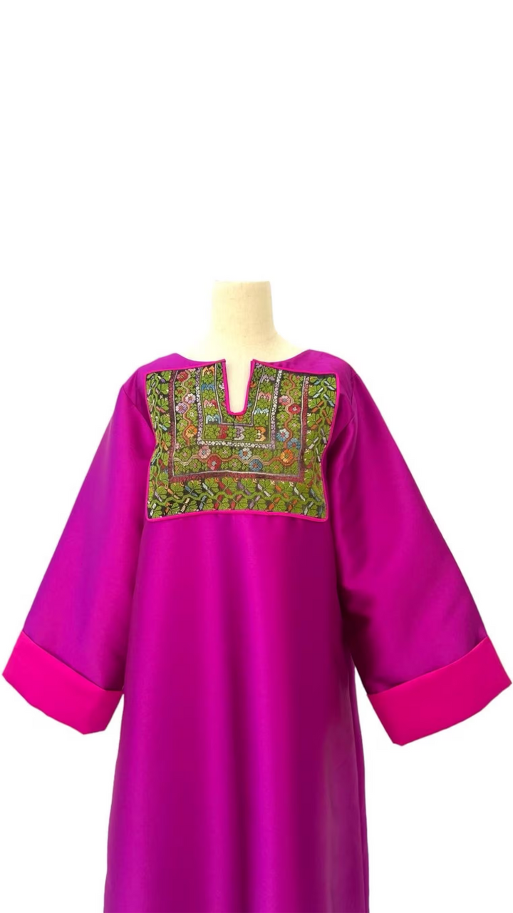 A unique Abaya that features old handmade original Palestinian embroidery pre 1970 from Ramallah with gorgeous floral motifs. The fabric is brocade silk in light Pistachio green.