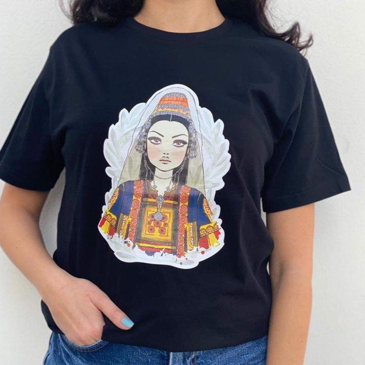 Our Athwabna collection features the Palestinian dresses and headdresses of each city and is now available on summer t shirts white and black colour. The Bethlehem dress shows the dress, headdress and jacket printed on cotton high quality t shirts....