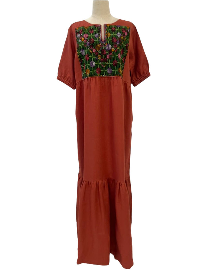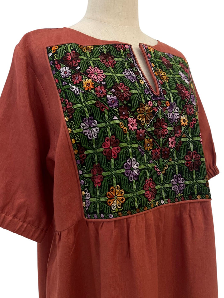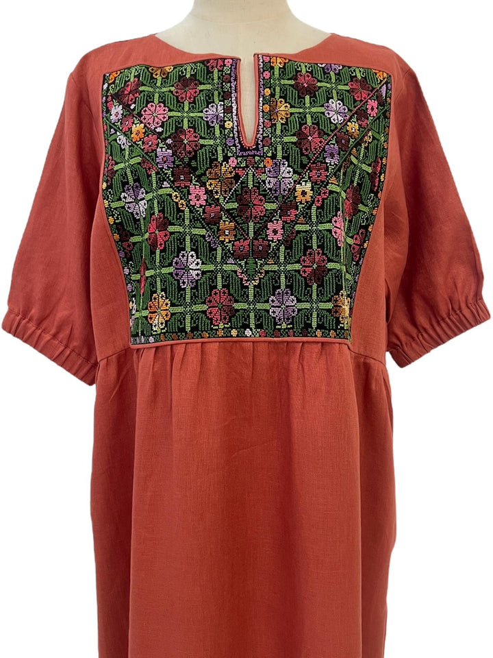 A lightweight linen dress with handmade old Palestinian Embroidery Chest panel pre 1970s.  Free Size Long Sleeve