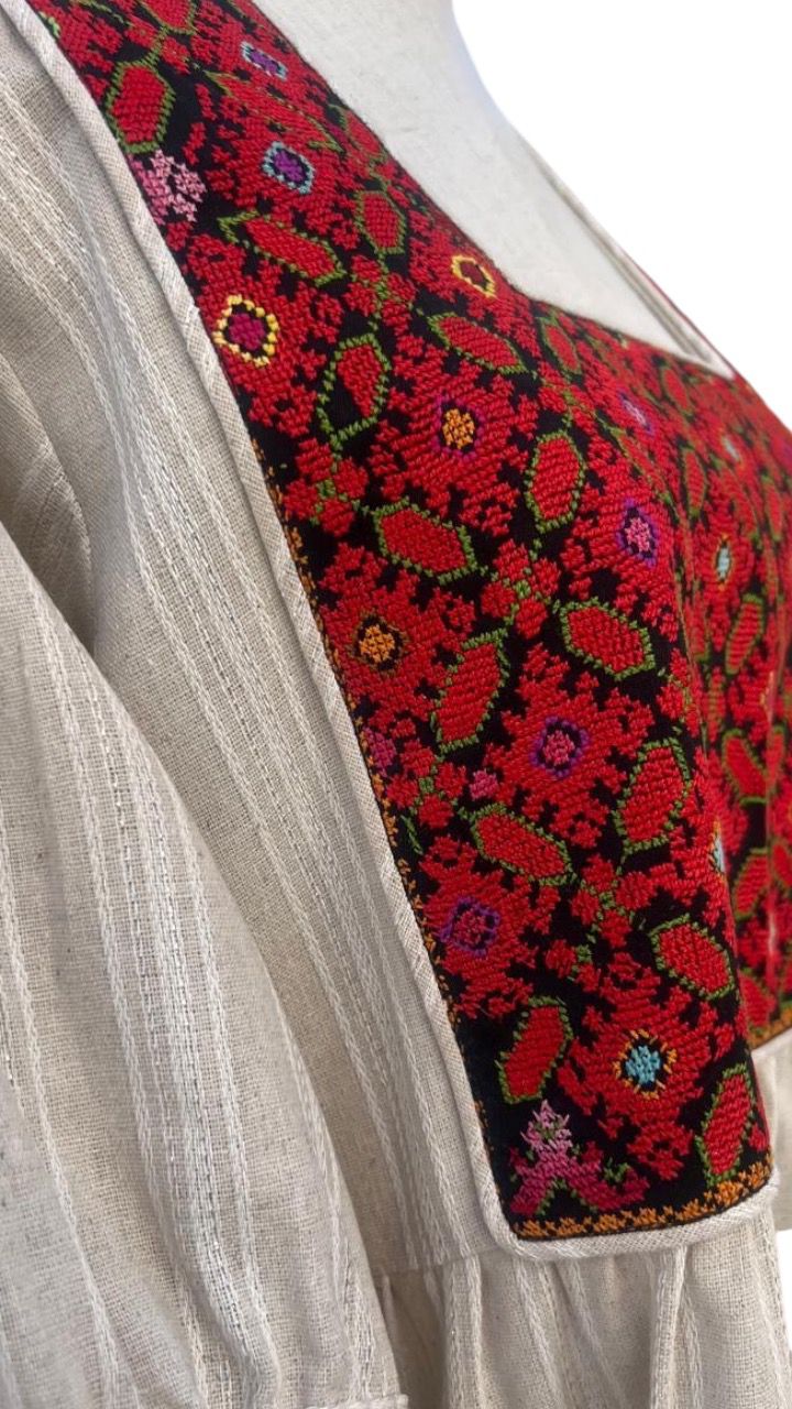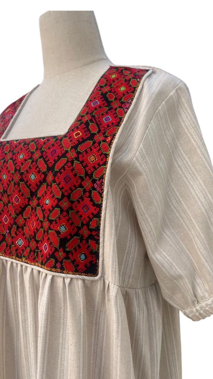 A lightweight linen dress with handmade old Palestinian Embroidery Chest panel pre 1970s. Free size