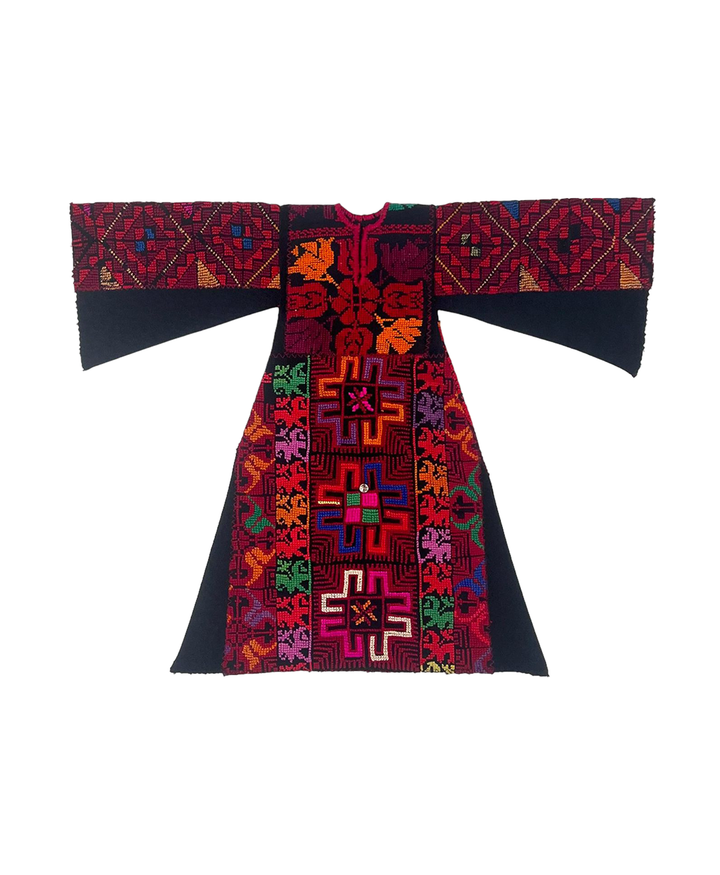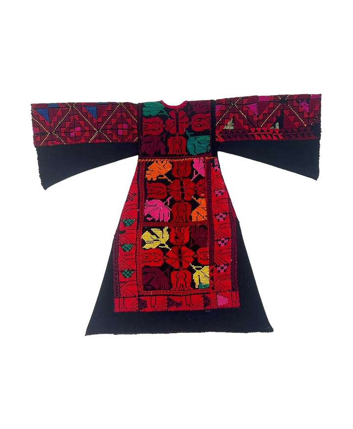 Embodying heritage and tradition, this unique creation captures a piece of Palestinian culture with its antique embroidery panels from circa 1900. Inspired by vintage doll dresses, each stitch holds the legacy of Palestinian craftsmanship, adding a touch of timeless elegance...