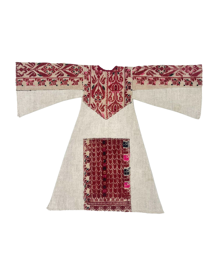 Embodying heritage and tradition, this unique creation captures a piece of Palestinian culture with its antique embroidery panels from circa 1900. Inspired by vintage doll dresses, each stitch holds the legacy of Palestinian craftsmanship, adding a touch of timeless elegance...