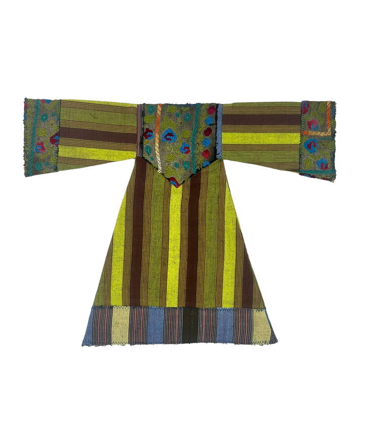 Embodying heritage and tradition, this unique creation captures a piece of Palestinian culture with its antique embroidery panels from circa 1900. Inspired by vintage doll dresses, each stitch holds the legacy of Palestinian craftsmanship, adding a touch of timeless elegance...