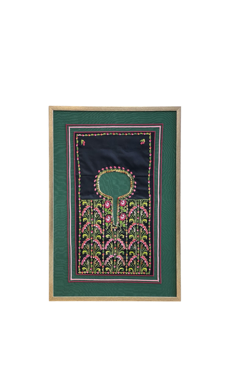 An orignal handmade Old palestinian embroidery chest panel of a dress from Hebron area done in the 1960's . Silk embroidery and mounted on moray silk material from damascus with frame . Size: 83x57 cm