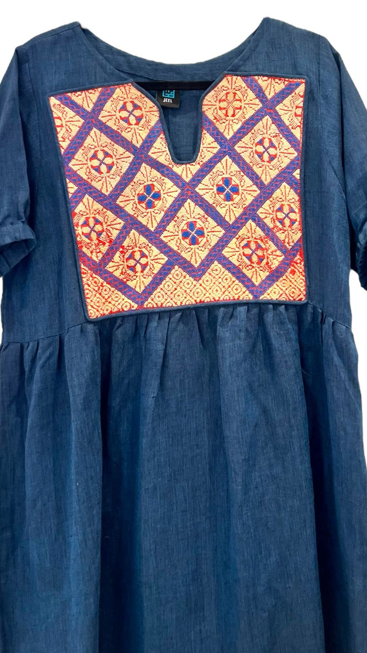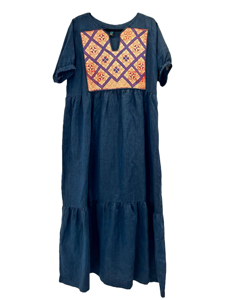 A lightweight linen dress with handmade old Palestinian Embroidery Chest panel pre 1970s. Free Size Long Sleeve