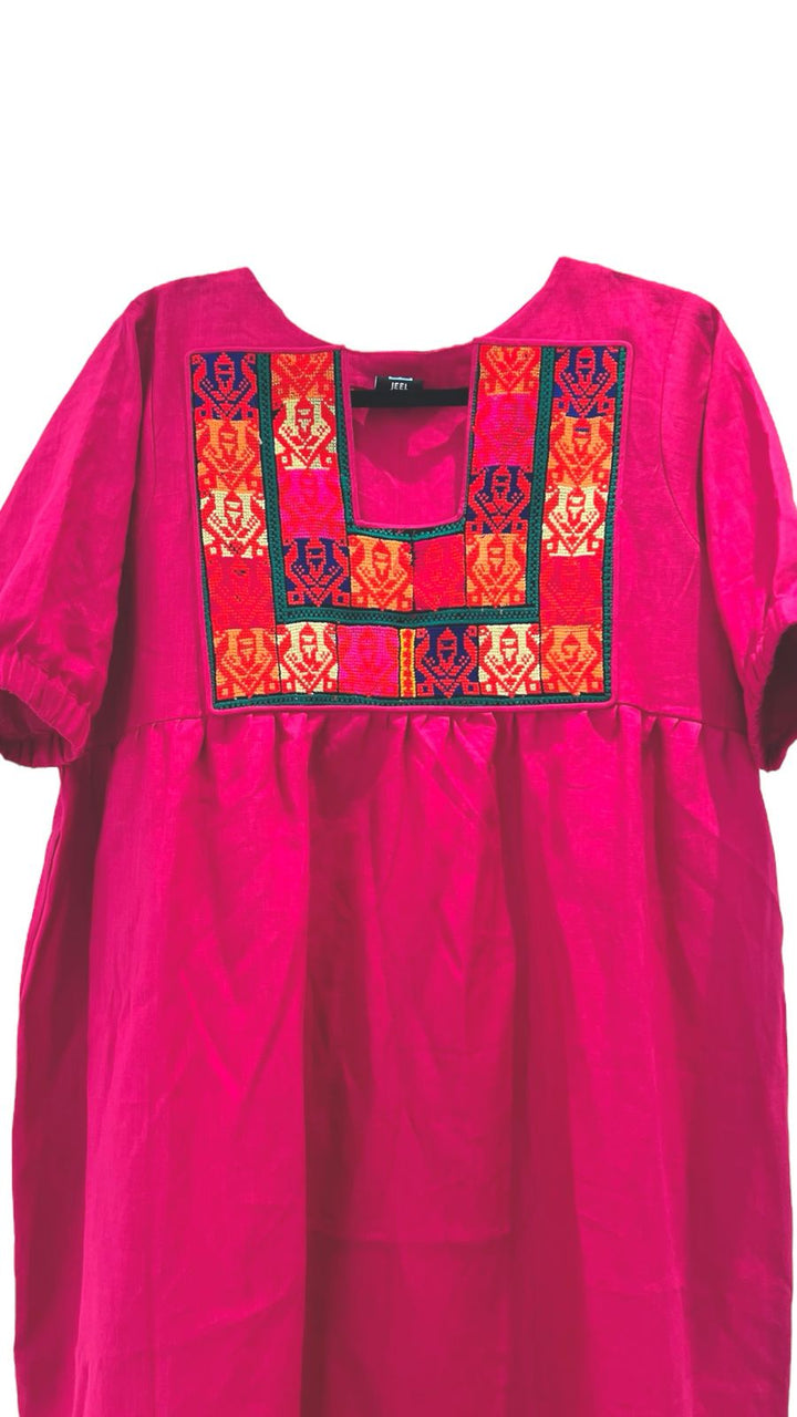 A lightweight linen dress with handmade old Palestinian Embroidery Chest panel pre 1970s. Free Size Long Sleeve