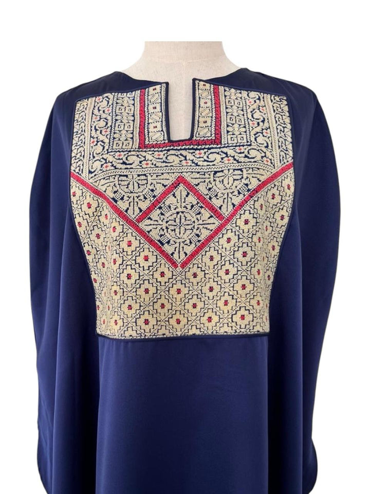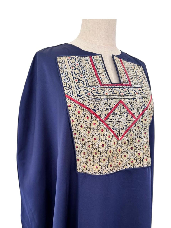 Silk Abaya Navy Blue with old Palestinian embroidery Chest Panel Jerusalem
