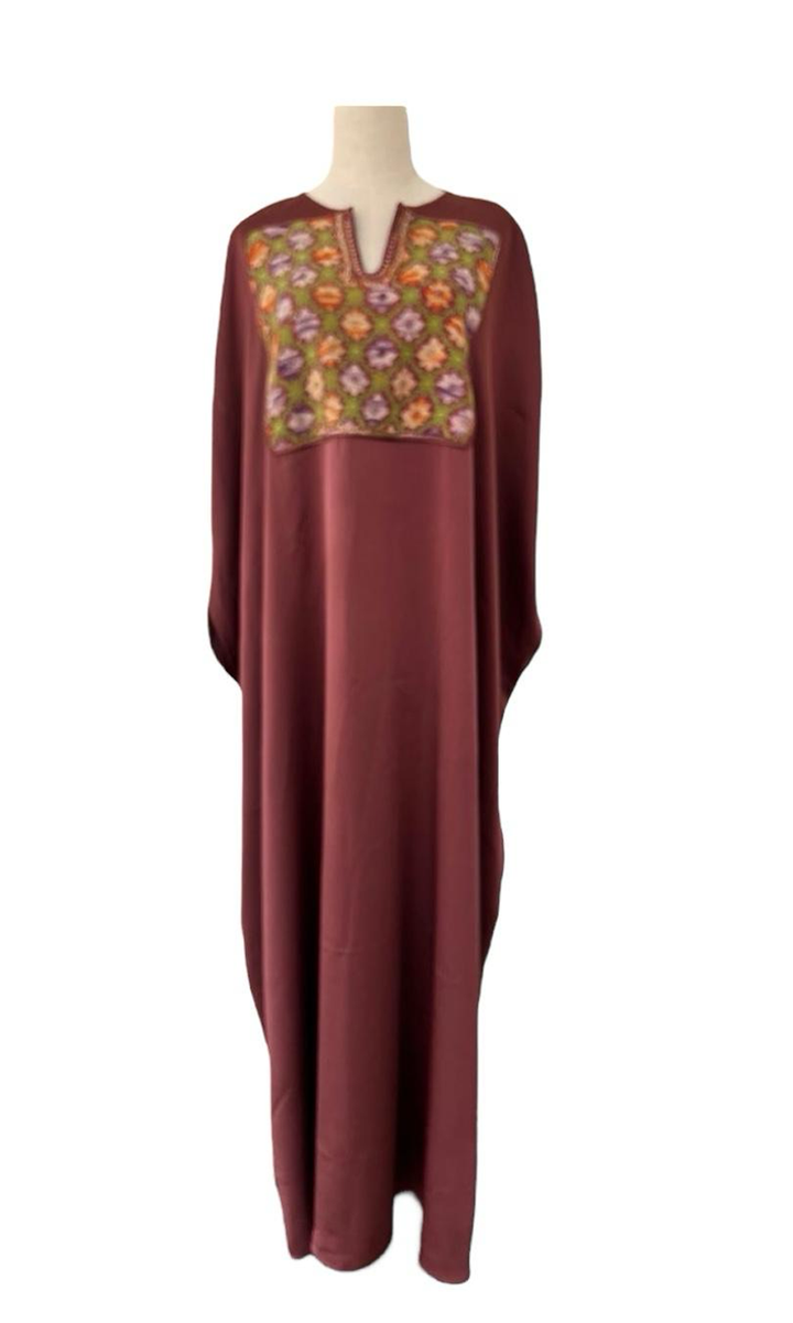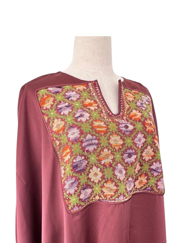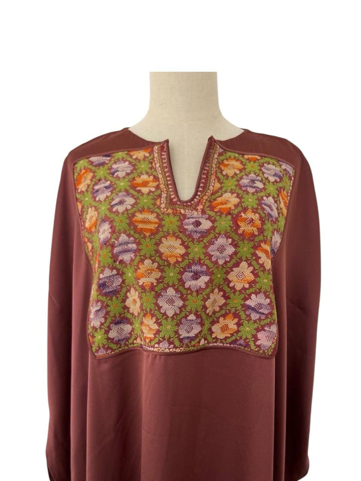 An original old Palestinian Embroidery Chest Panel from Hebron area. Done in the 1960's silk embroidery on cotton. Design with our unique silk material and free size Tail shirt. Free Size