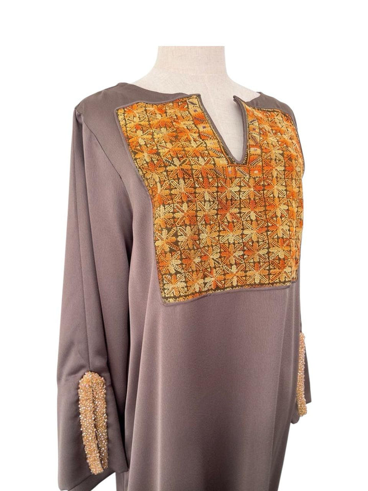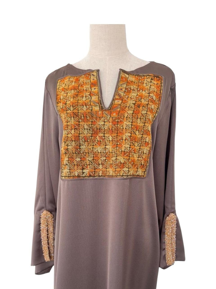 Crepe Abaya brown with old Palestinian embroidery chest panel of a dress from Jerusalem area . Done in the 1970's Free Size