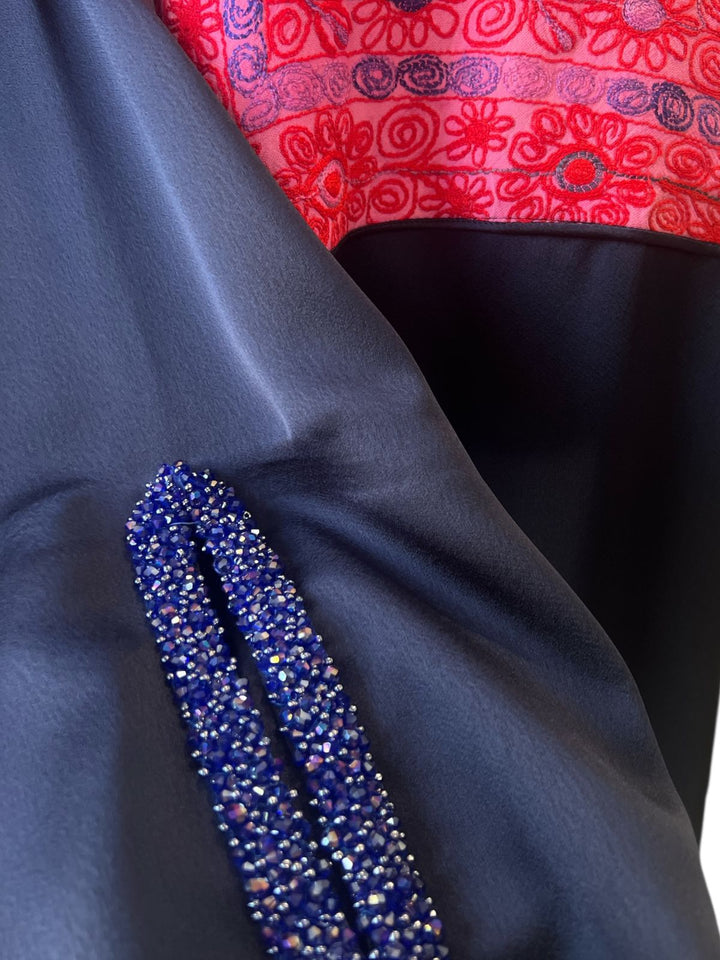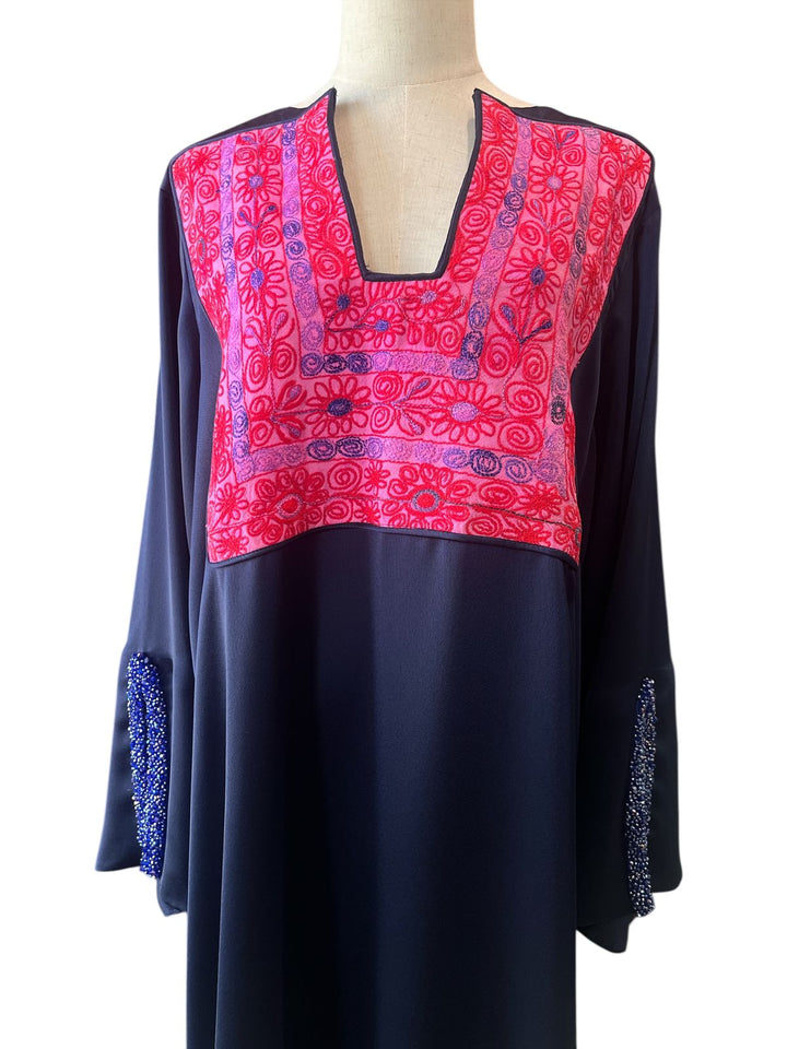 Crepe Abaya brown with old Palestinian embroidery chest panel of a dress from Jerusalem area . Done in the 1970's Free Size