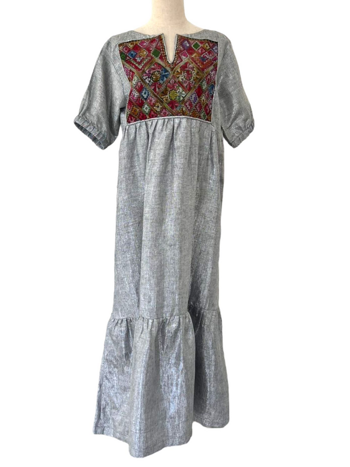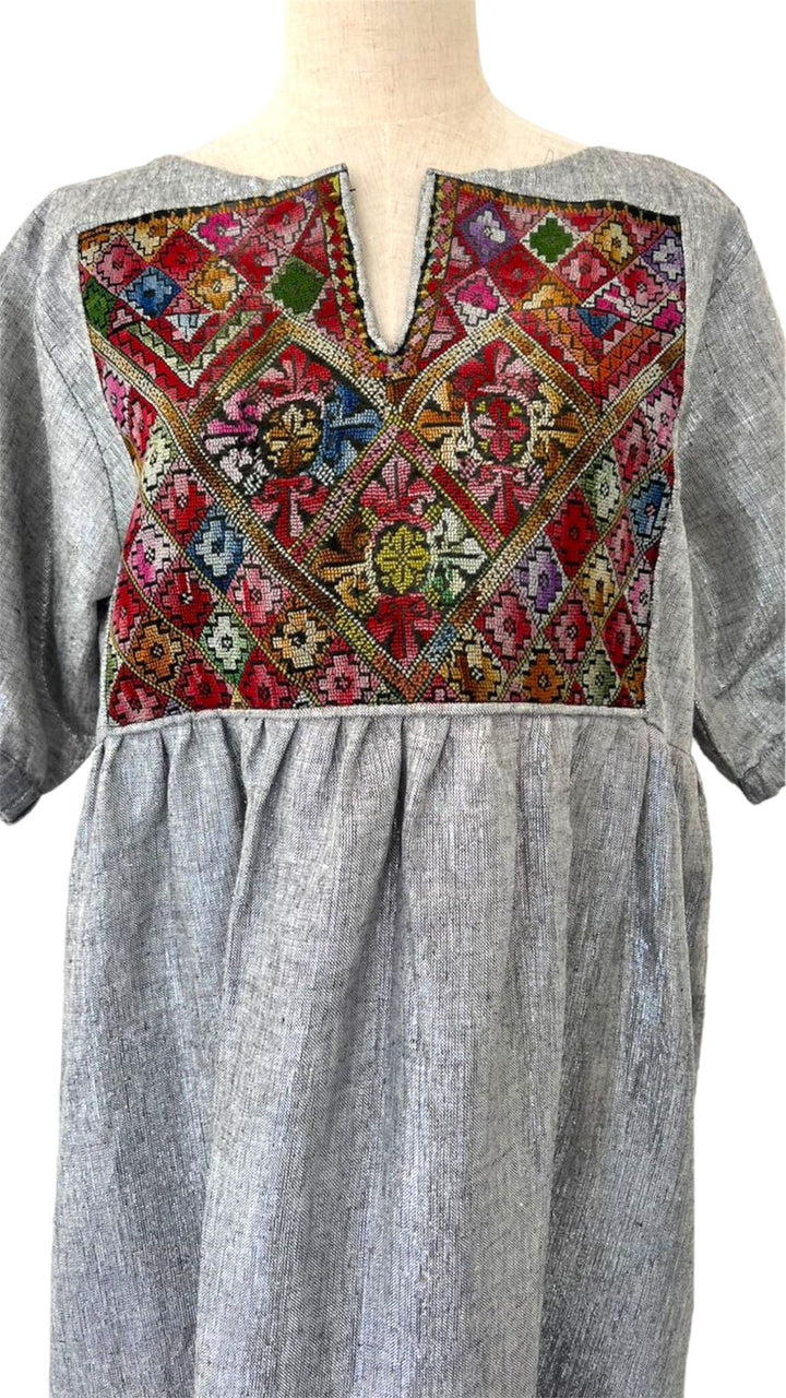 A lightweight linen dress with handmade old Palestinian Embroidery Chest panel pre 1970s. Free Size Long Sleeve