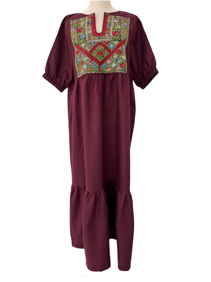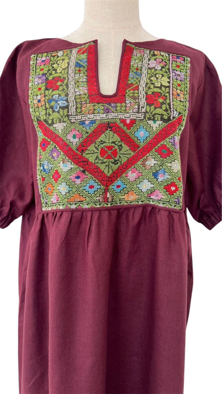 A lightweight linen dress with handmade old Palestinian Embroidery Chest panel pre 1970s. Free Size Long Sleeve
