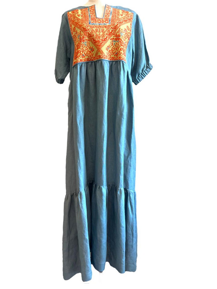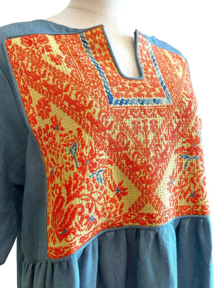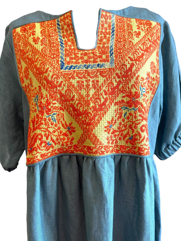 A lightweight linen dress with handmade old Palestinian Embroidery Chest panel pre 1970s. Free Size Long Sleeve