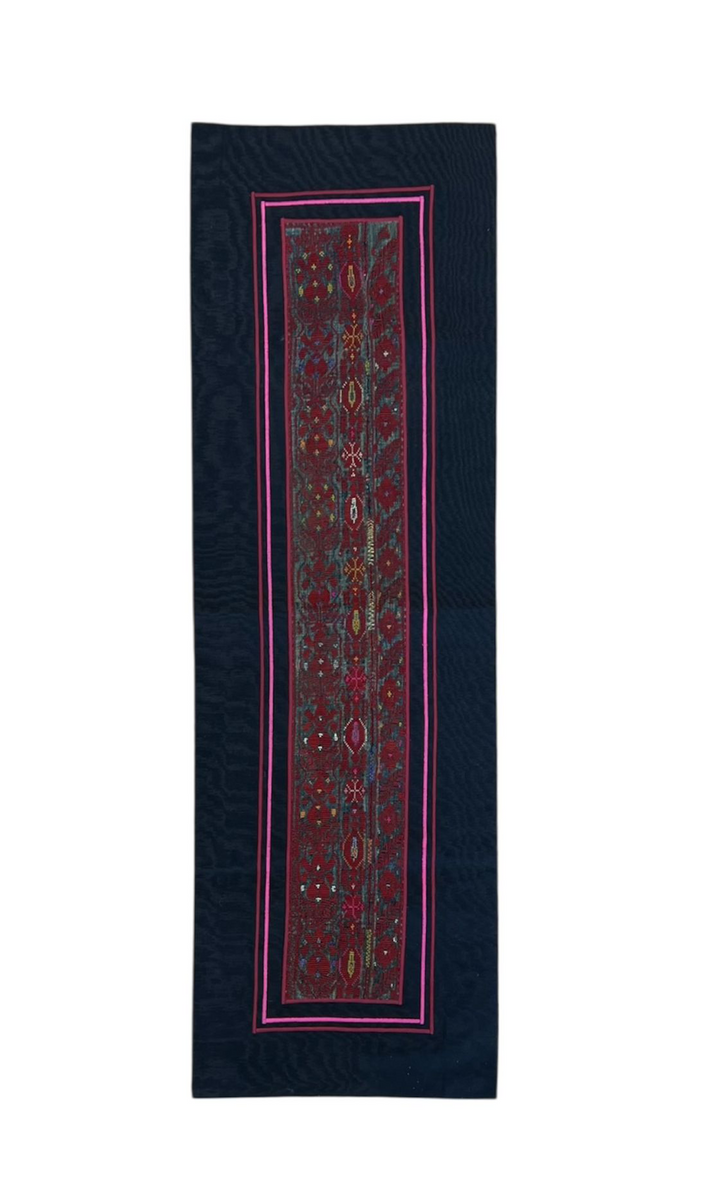 An original antique Palestinian Front Panel of a dress from Ramallah wedding dress , the antique Roomi hand loomed linen with silk embroidery cross stitch from the 1920's. Mounted on Moray silk from Damascus with satin stitch. 110x40cm