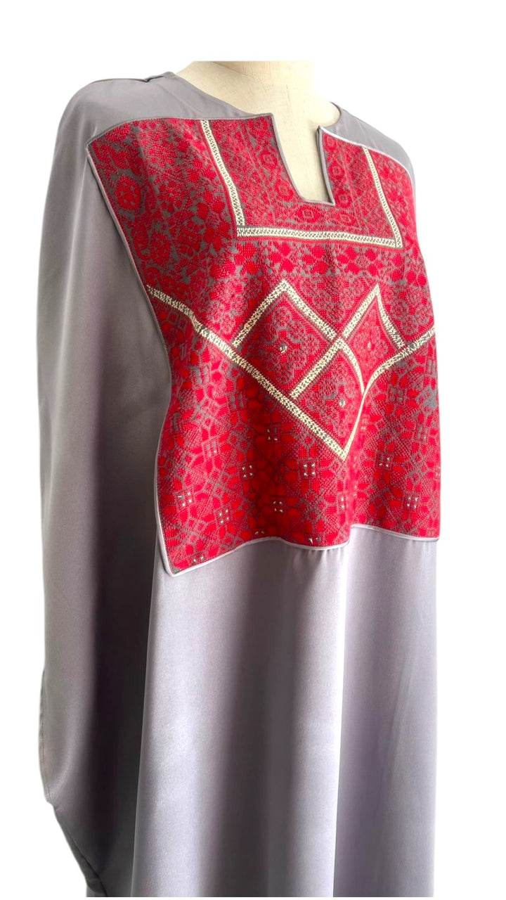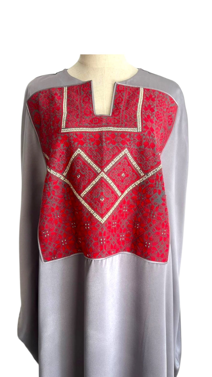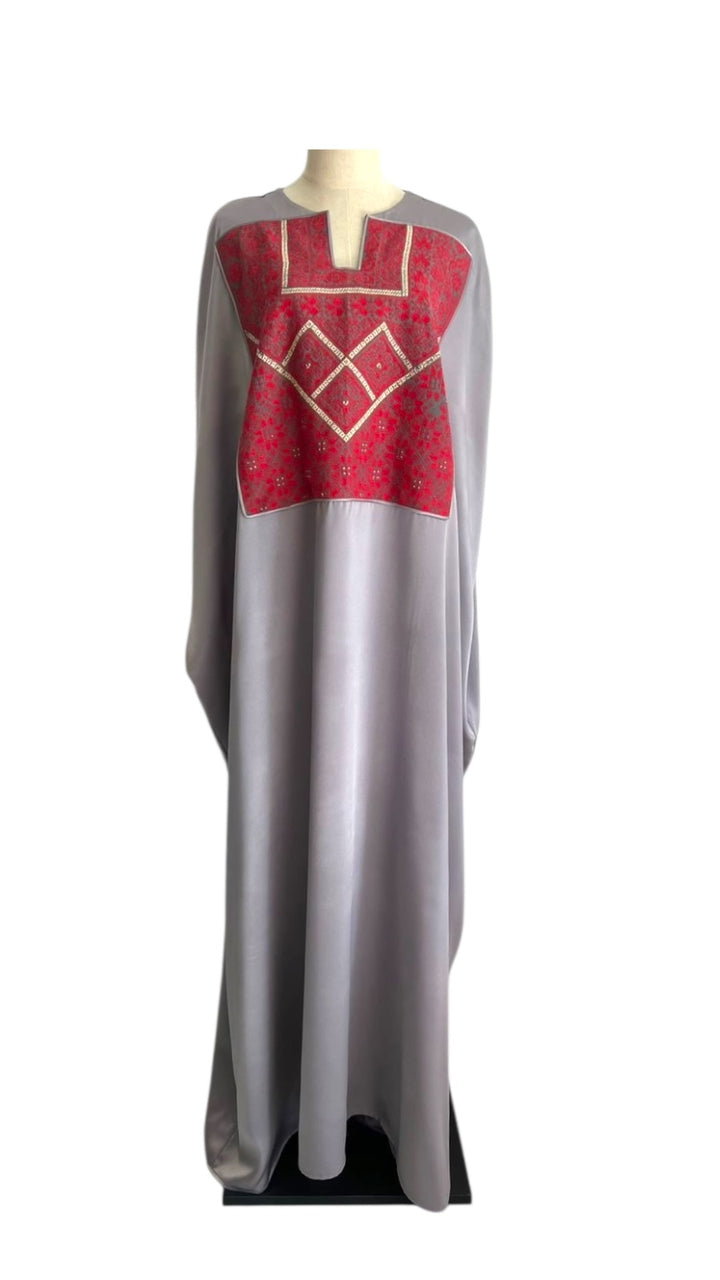 Silk dove gray Abaya with Old Palestinian Embroidery panel 1970's