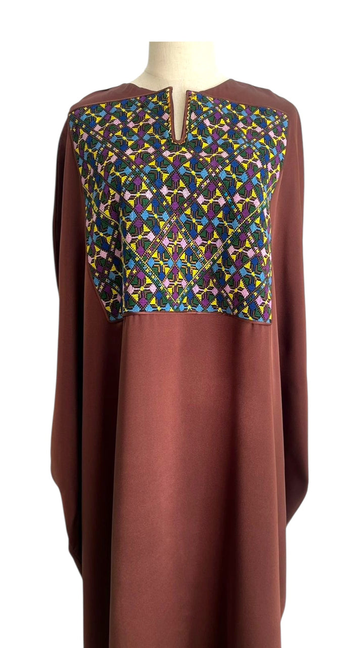 Crepe Abaya brown with old Palestinian embroidery chest panel of a dress from Jerusalem area . Done in the 1970's Free Size