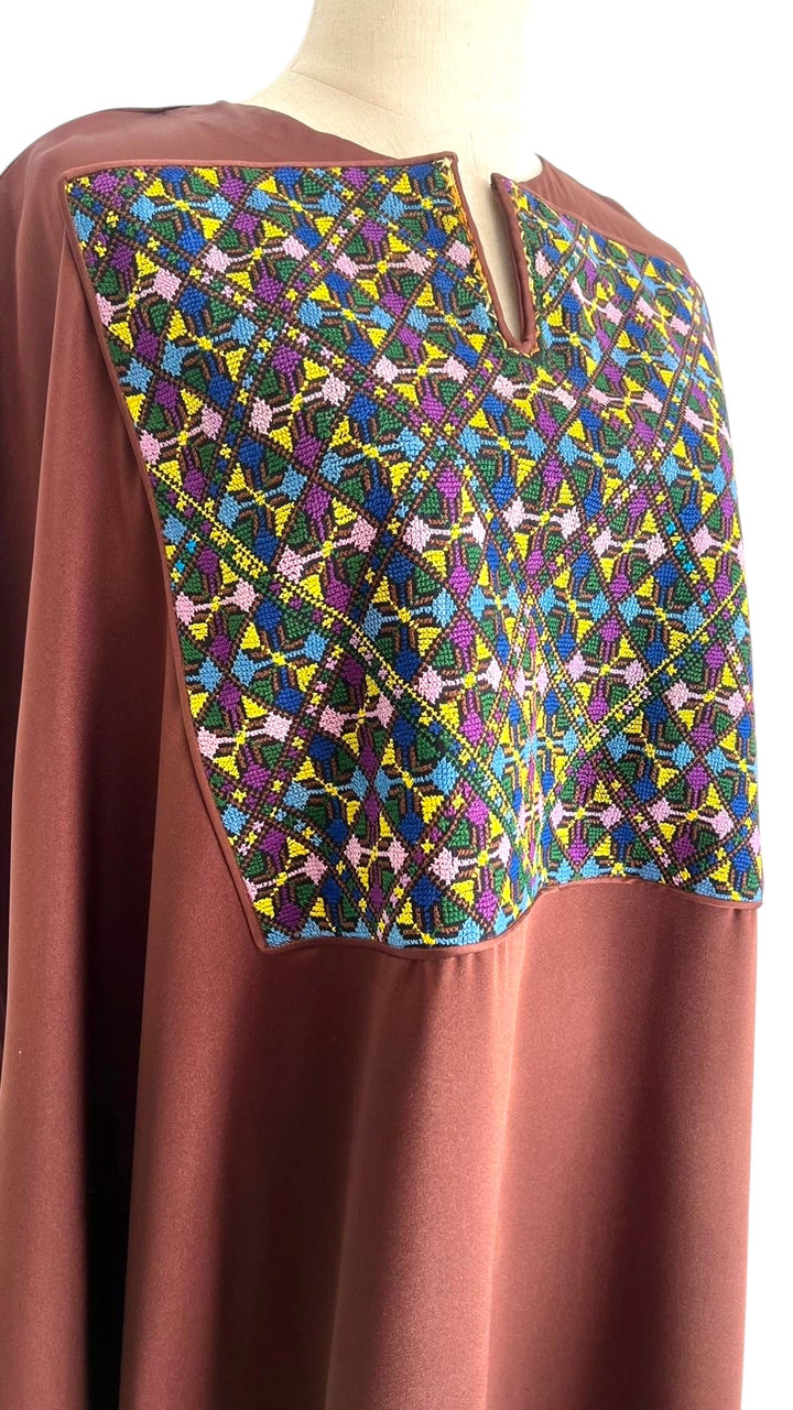 Silk mocha brown Abaya with Old Palestinian Embroidery panel 1970's