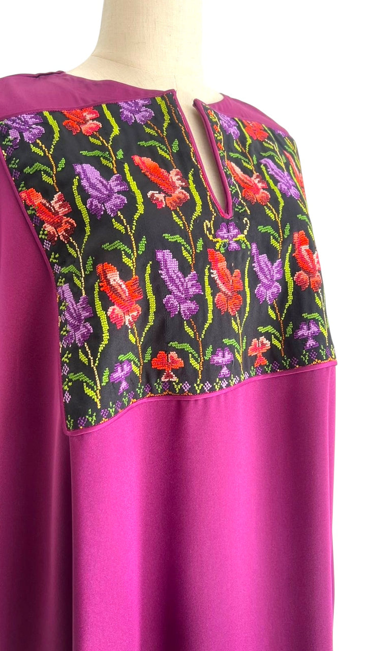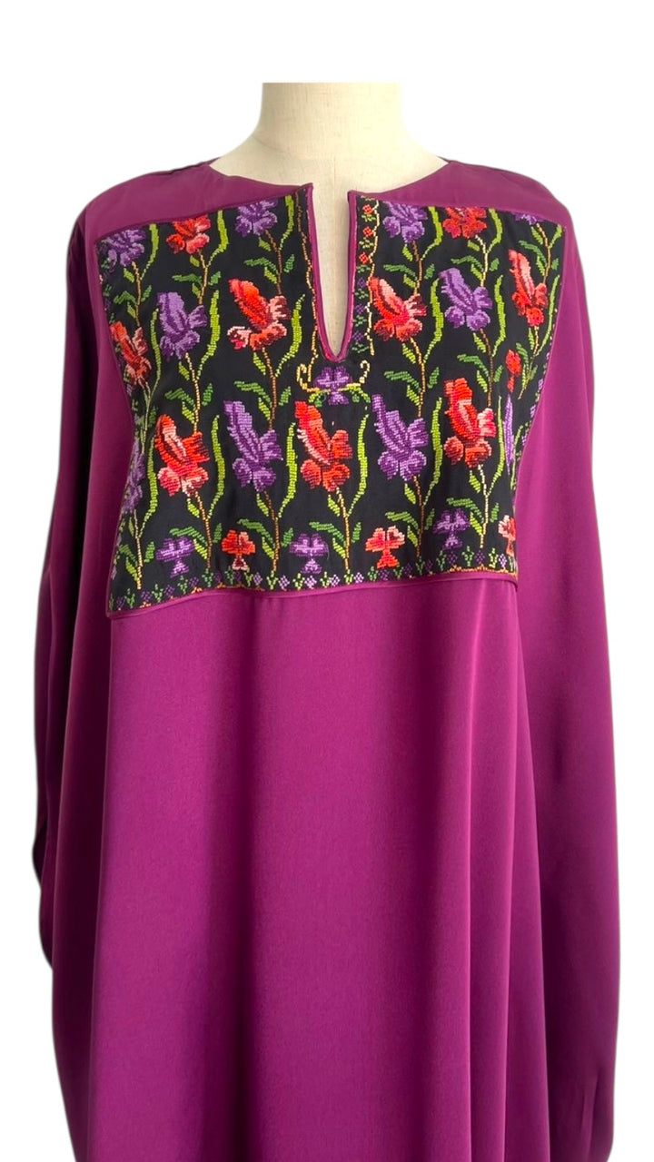 Silk plum Abaya with Old Palestinian Embroidery panel 1970's